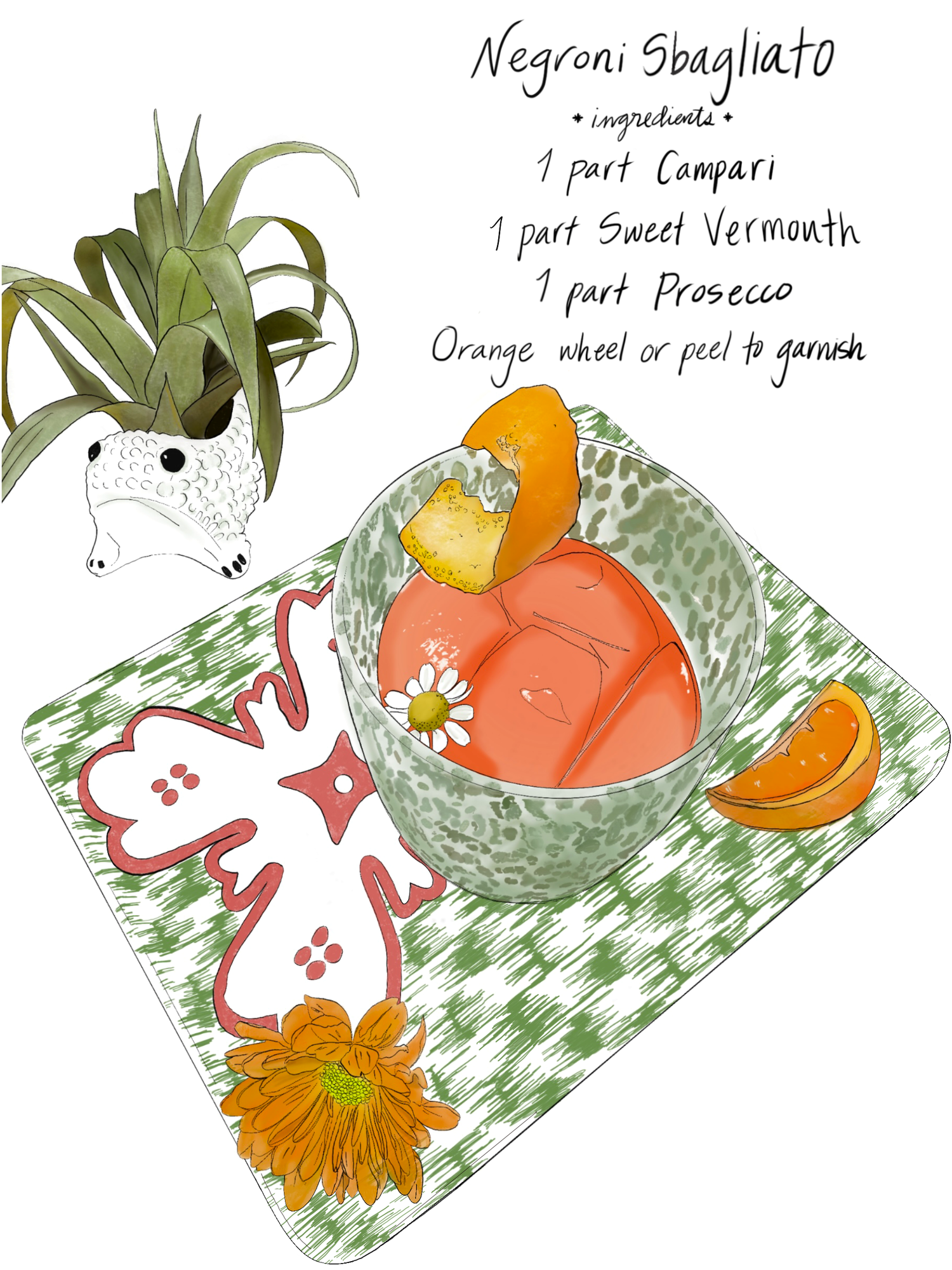 Cool down this summer with Alessandra’s favorite cocktail, the Negroni Sbagliato — a cocktail invented by Mirko Stocchetto in 1972 Milan at the historic (and still open) Bar Basso. The story goes that Mirko accidentally grabbed a bottle of prosecco instead of gin while making the classic Negroni, and so the Negroni Sbagliato was born. "Sbagliato" means "bungled" or "mistaken," in Italian.