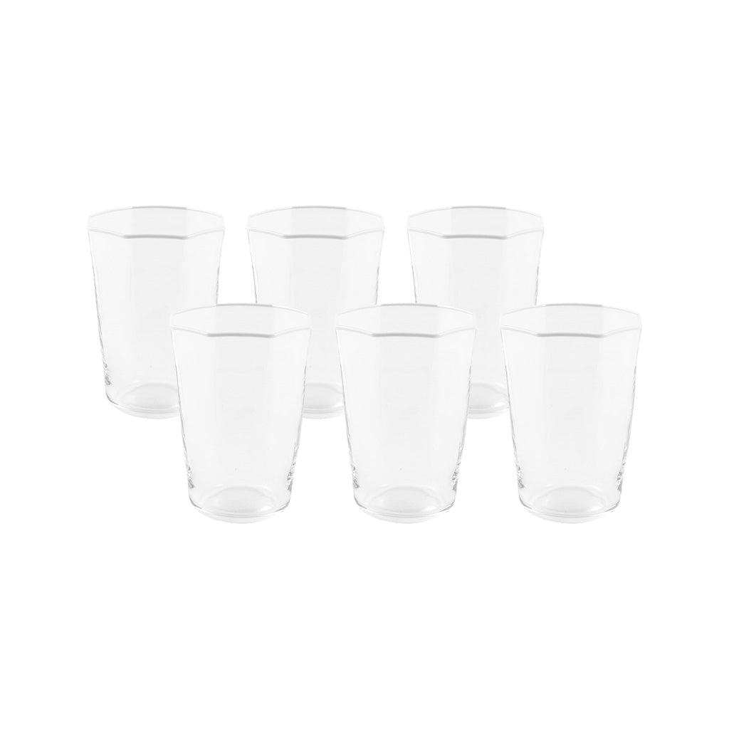 Individually hand-blown in a small French workshop, our Otto Tumblers provide an artful presence to your table setting. Available in a variety of colors, both clear and opaque, with accented color along the octagonal rim.