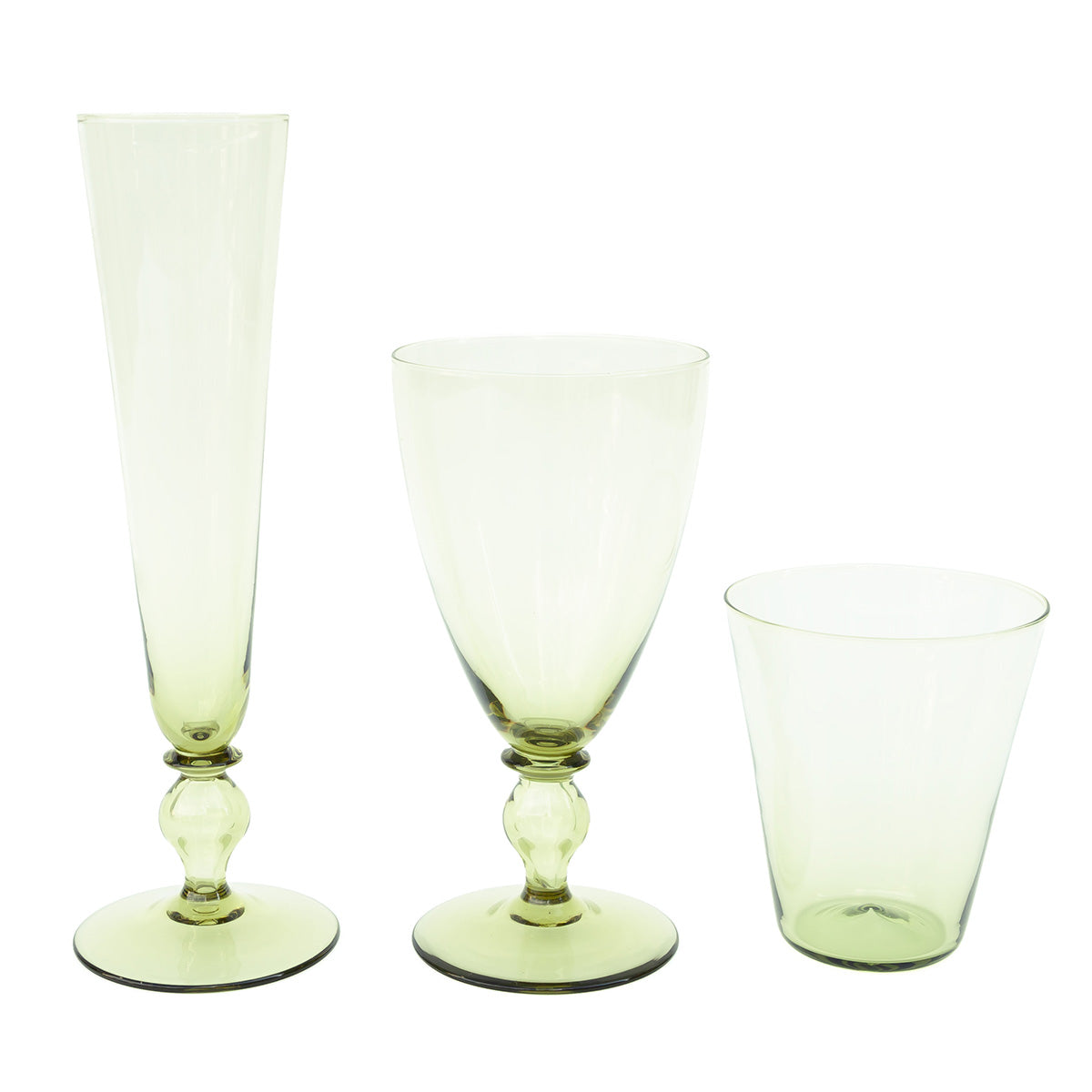 Add character to your dining table with these classically inspired wine glasses. Lightly tinted a lovely mossy green, these hand-blown glasses work for water or wine and pair well with our nature-inspired Papavero Rigato Porcelain.