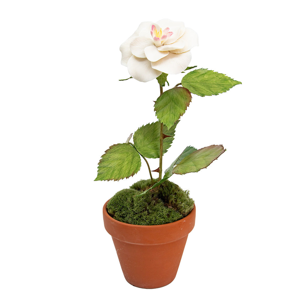 A beautifully balanced and joyful floral sculpture by French artist Samuel Mazy. Handcrafted in porcelain and copper with wonderful painted details and set in a terracotta pot.