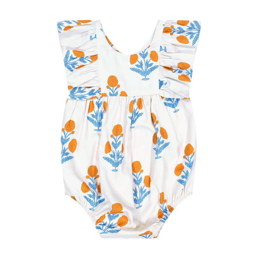 Our coordinating Orange Floral and Blue Stripe prints are the perfect compliment to one another for sibling coordinated summer days or mix-and-match options, alike.