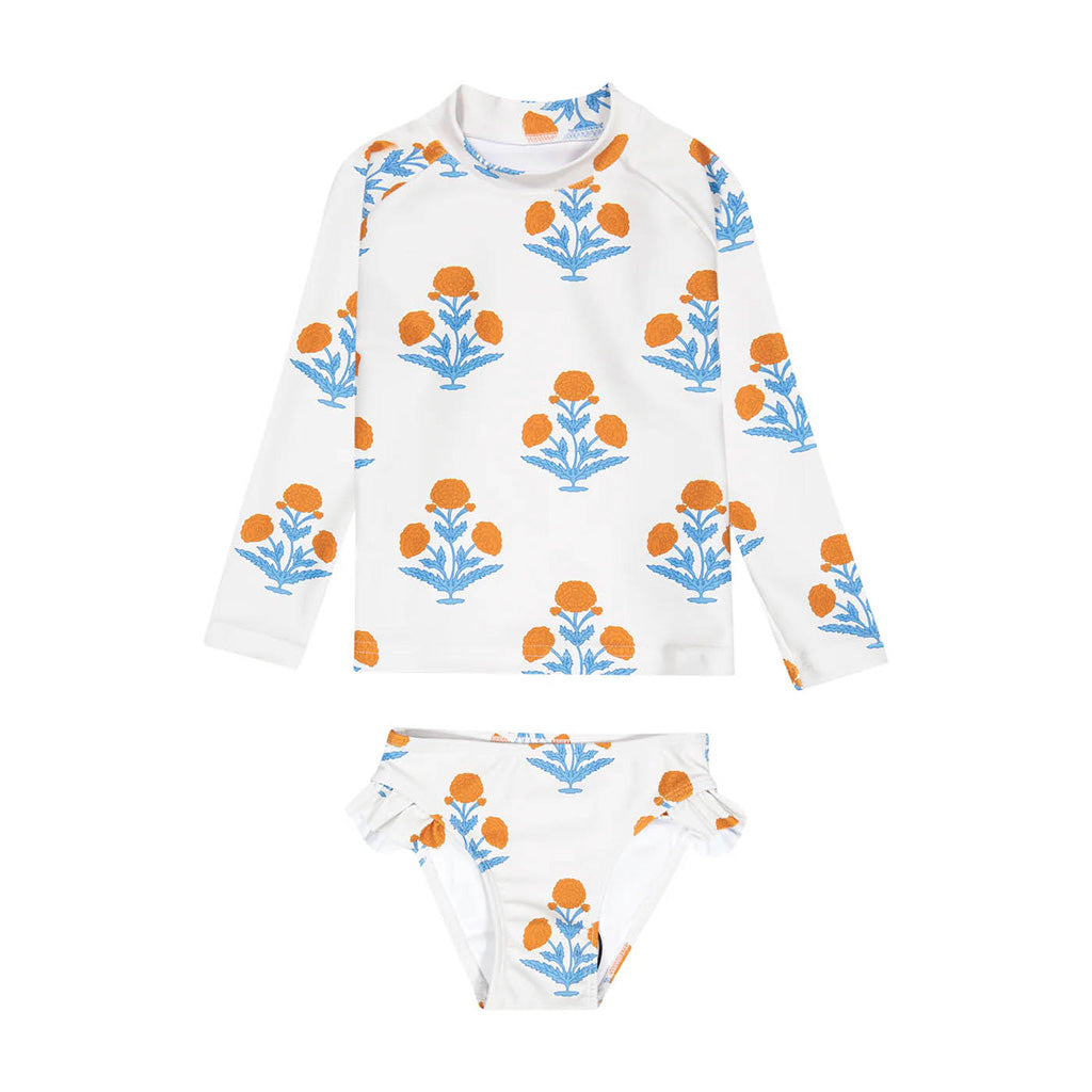 Our Rash Guard Set is an 80% polyester / 20% spandex blend — a perfect fit for the summer sun that offers additional sun protection! The Rash Guard is paired with a sweet, ruffle-detailed two-piece bottom. Please note that this set includes top and bottom.