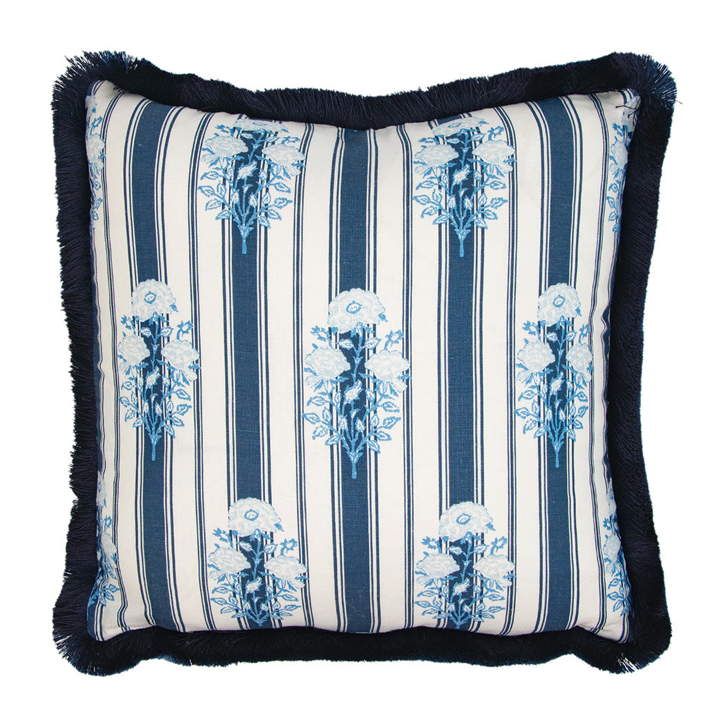 Bold stripes balance a delicate Indian rose to create a soothing design. Features brush fringe.