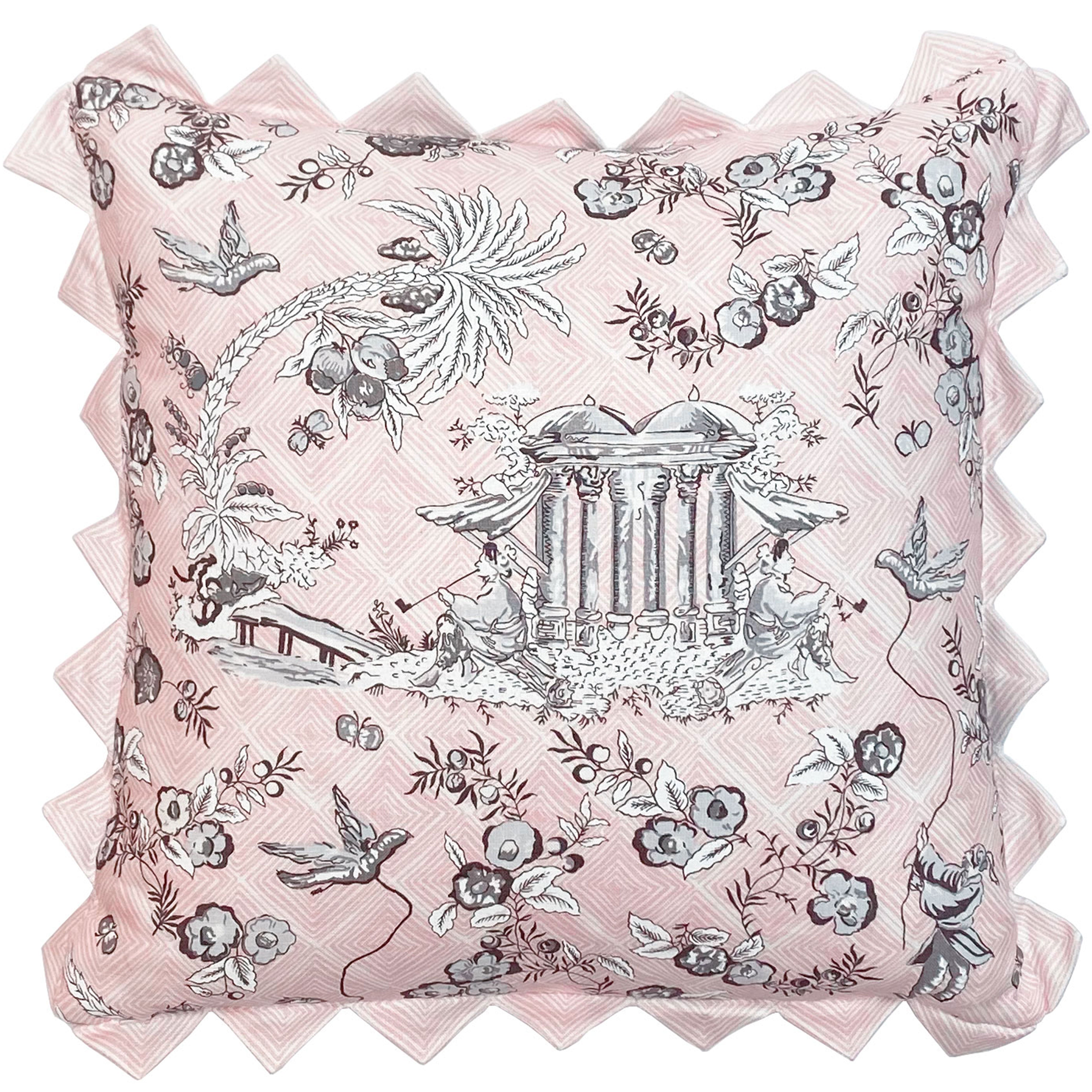 Pavilion is a lively, toile-like design inspired by an 18th-century Italian panel. It features a figural scene with architectural details, set upon a background of our Quadrato pattern. Following the hand-drawn lines of Quadrato's concentric squares, a festive trim adds its own architectural element to this playful pillow.
