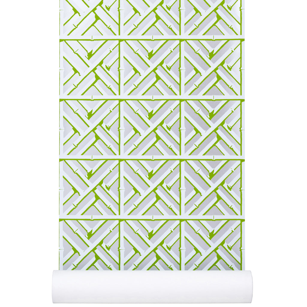 Fretwork, from the French word for lattice, has a transportive quality. This pattern convincingly imagines an architectural form of bamboo that transforms rooms with structure and color.