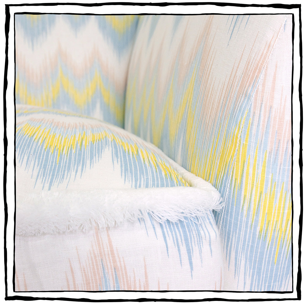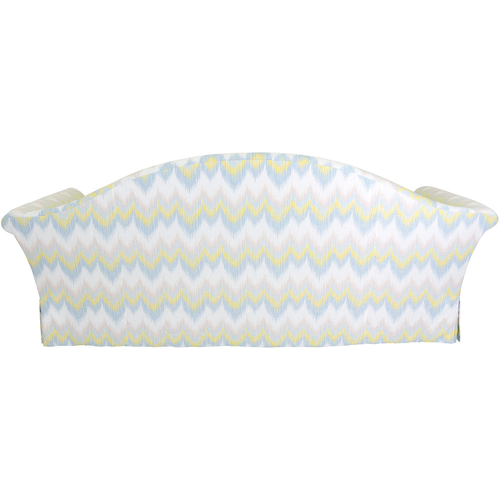 Our Casa Branca Collection Brighton Sofa with a curved back on turned ebonized legs with antiqued brass cup casters, upholstered in custom Fiamma fabric, designed specifically for our new Atelier space. The 50/50 down/feather-filled cushions provide a soft feel with just the right amount of support and hand-tied coil platform springs ensures for lasting comfort and quality.