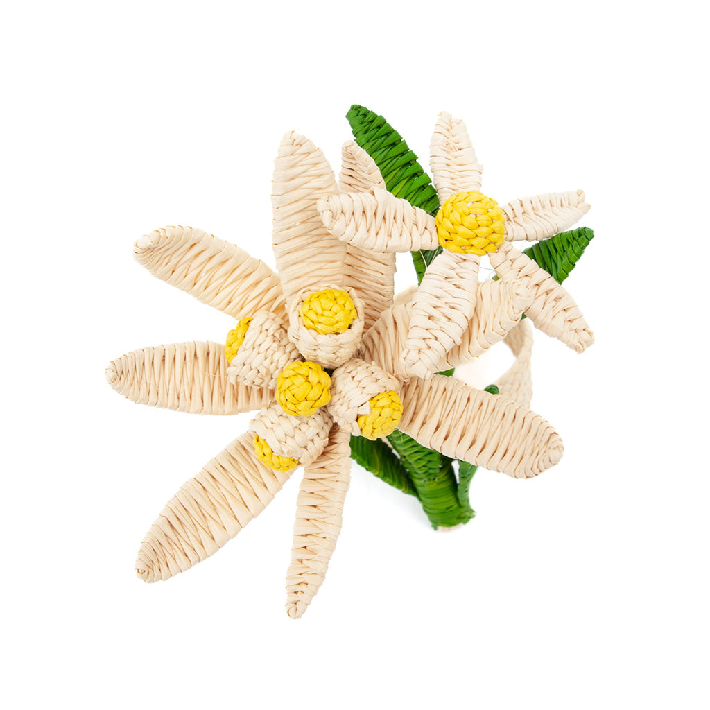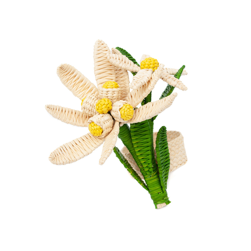 These handmade napkin rings are expertly crafted and beautifully shaped as a double flower that will bring a smile to the face of any guest. They add a special pop of color and scale to your table setting, with an uncommon height and three-dimensionality.