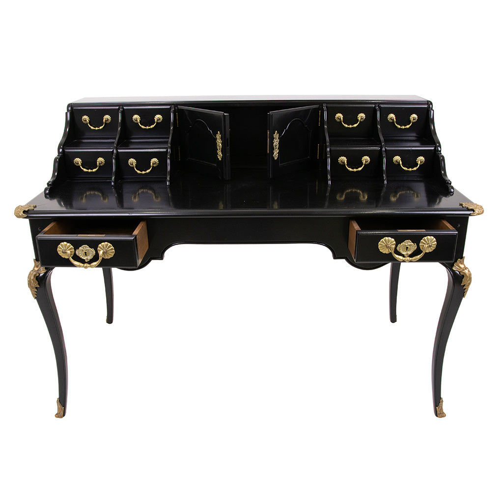 This Louis XV Style Writing Desk features black lacquer, gilt bronze hardware, and elegant cabriole legs. Made in France during the 1950's, it is a perfect addition to any home or office.