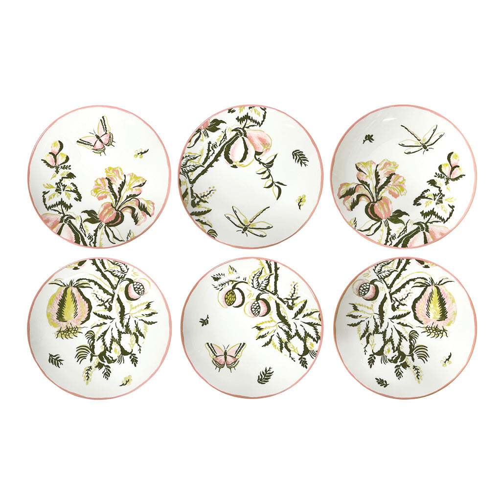 This set of six exquisite dessert plates features a meandering scene of florals, butterflies, and dragonflies taken from a motif carried over from our textile collection. Designed to playfully mix with other designs in our collection or to spruce up more traditional settings. Produced on porcelain of the highest quality in Limoges, France. These dishes were awarded Architectural Digest's Great Design Award in 2022.