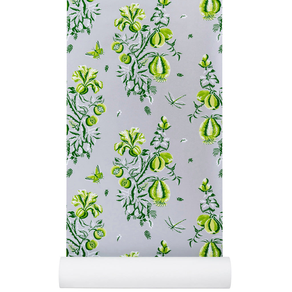Fresh and retro all at once, Nantes has a painterly quality that suspends time. Based on an 18th-century silk, it has been reinterpreted in design and scale and printed here on silver paper with an elegant reflective quality.