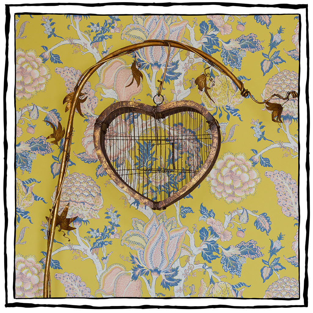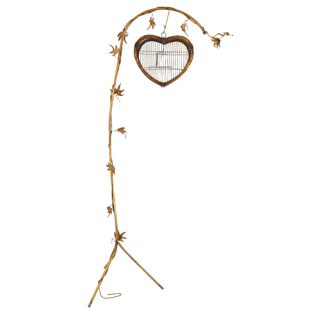 These elegant gilt metal bird cages were sourced from an Art Nouveau Hotel in Belgium. Delicately wrapped in the shape of hearts, with vine motif stands, these dramatic accent pieces could be electrified into floor lamps for added warmth and light.