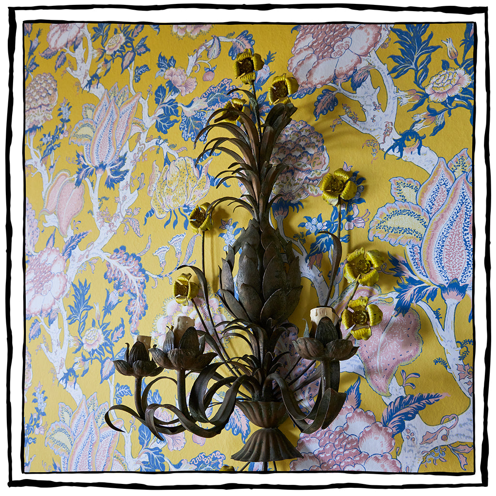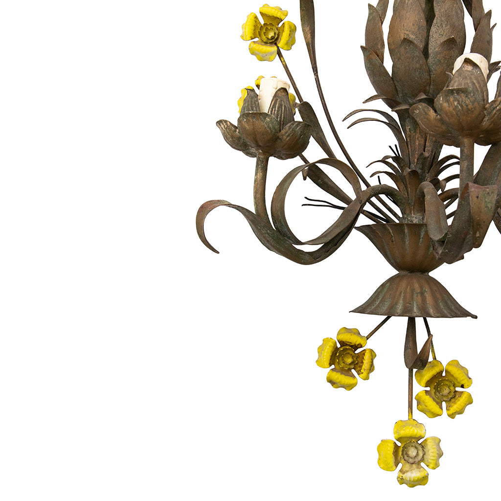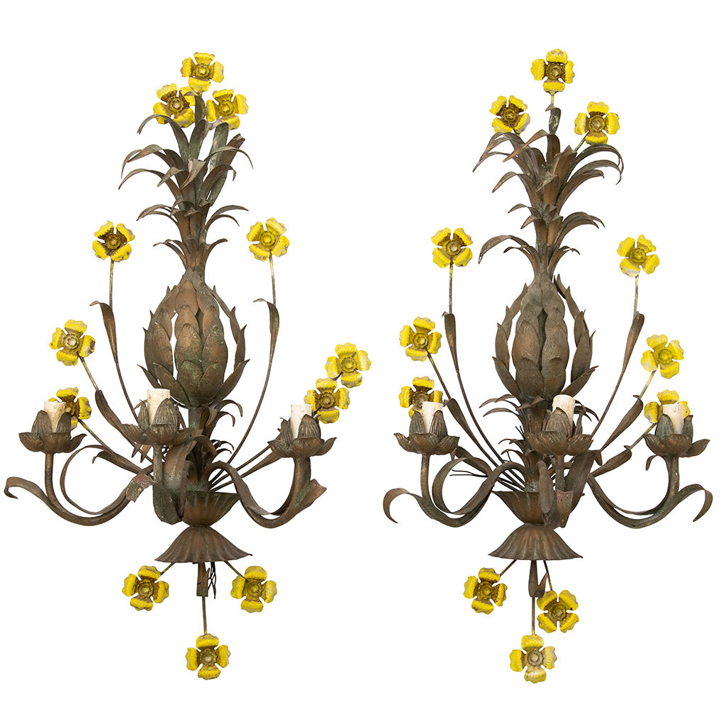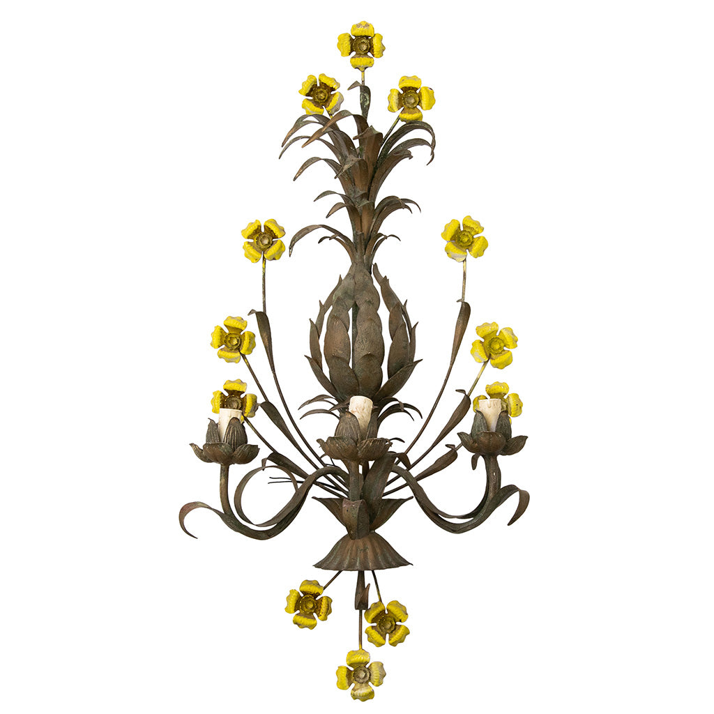 - Pair of Large Wrought Iron Sconces with Painted Yellow Flowers