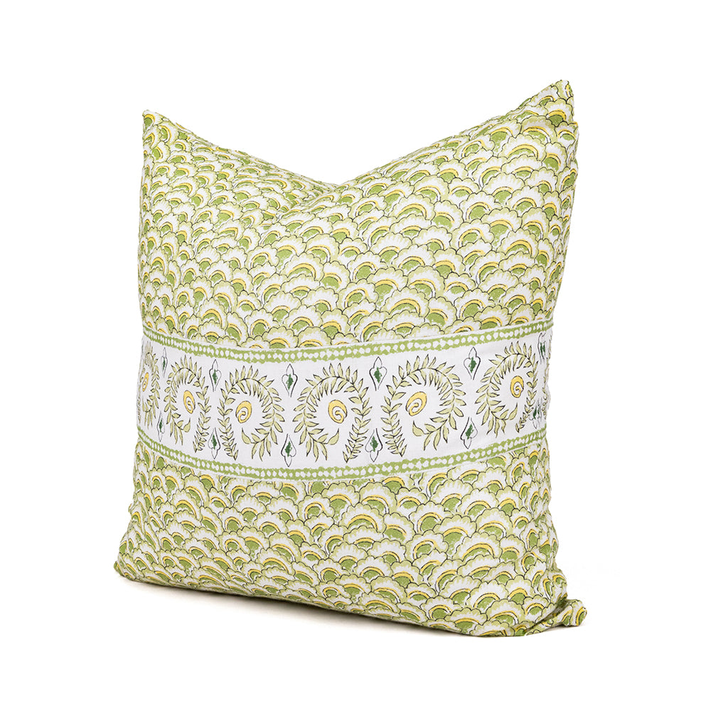 Palampore Petal's tight repeat makes it perfect for this pillow. Its companion, Palampore Stripe, is used as a decorative accent across the middle for a bold, playful touch.