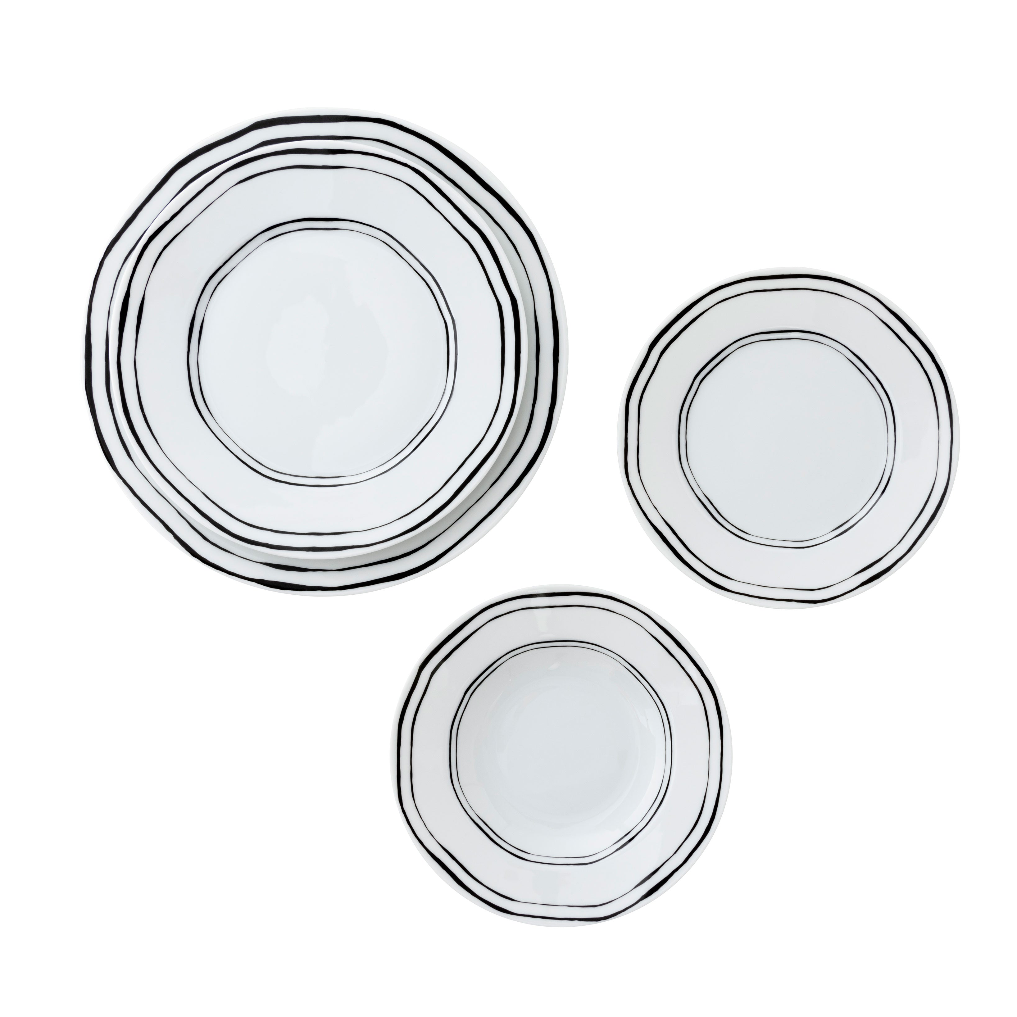 Produced on porcelain of the highest quality, our signature double-line border adorns these elegant dishes. The design forms a natural frame for smaller, graphic plates, or a series of concentric circles when used as a set. Classic design with a modern twist.