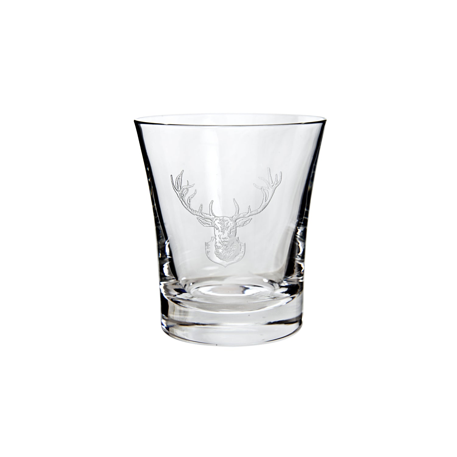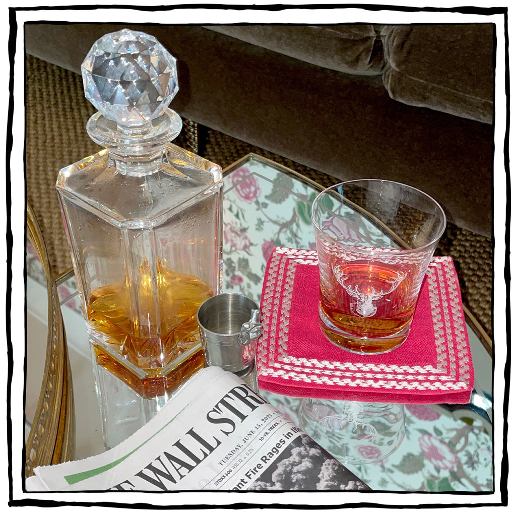 A stag’s head Alessandra discovered in a book of 18th-century prints is translated into an emblem engraved on glassware, printed on plates, and embroidered on pillows and blankets. “This one has many, many points on his antlers,” indicating age, she says. “I love imagining that he’s lived a good long life.”