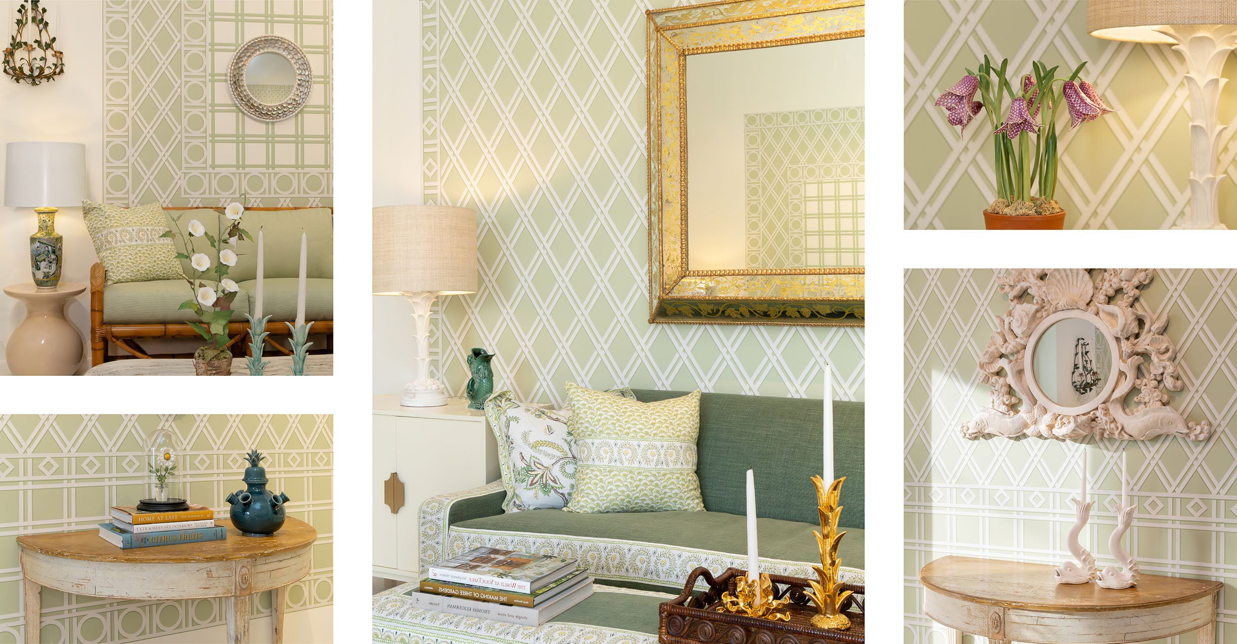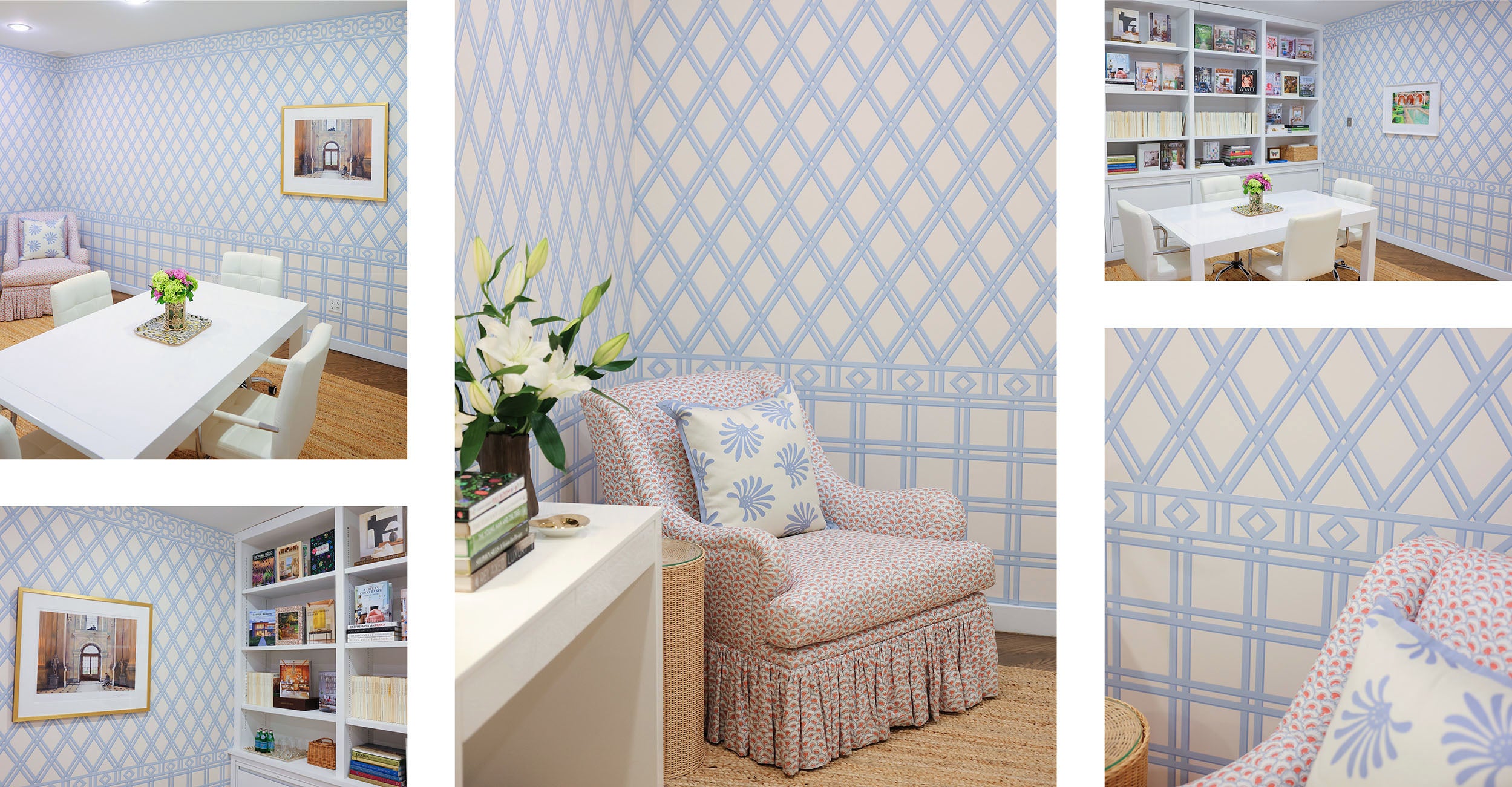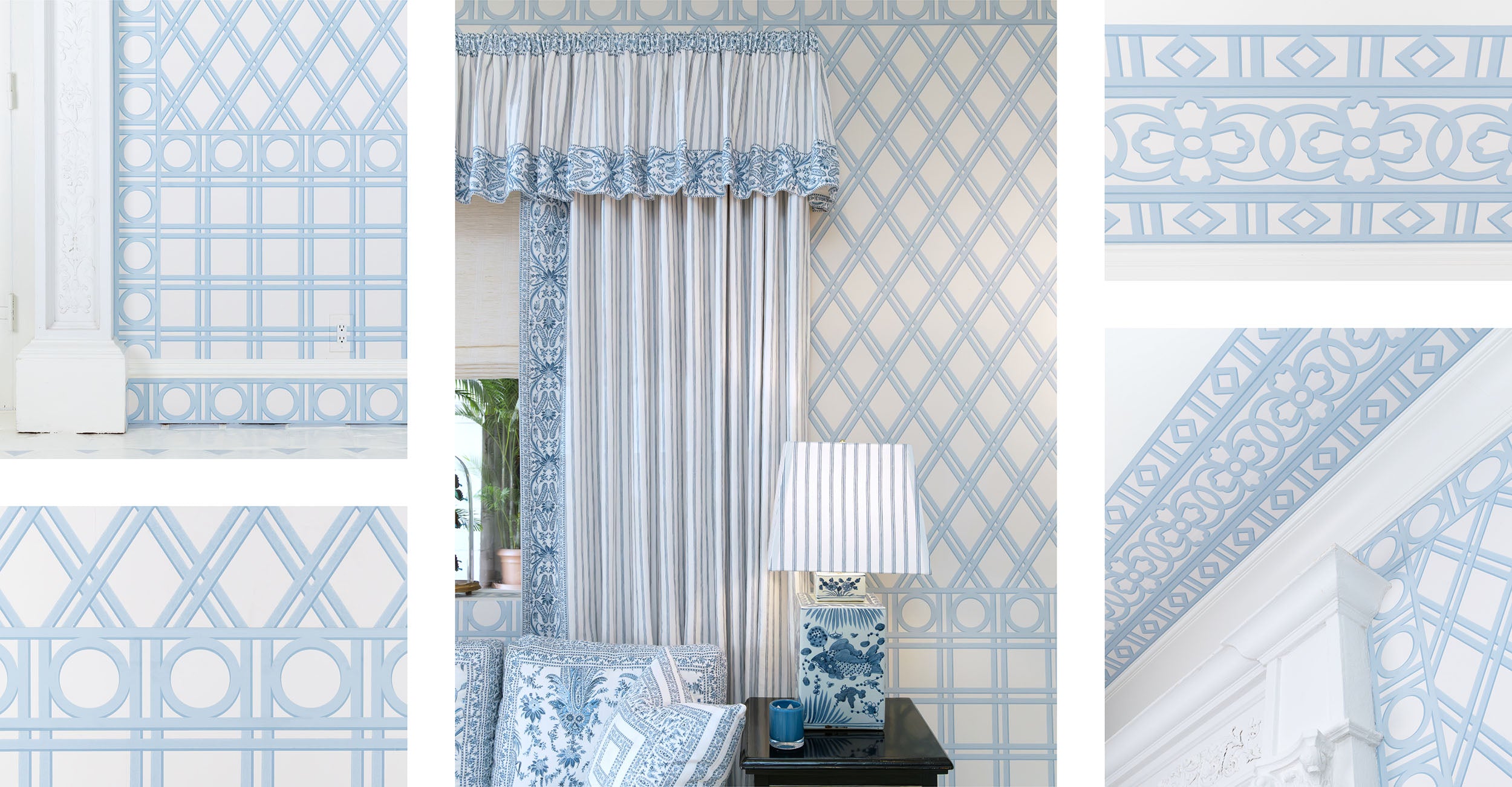 Trellina appears in different configurations on each wall at our Atelier & Showroom. One features wainscoting with Quadri all-over, Diamond border, and Tonda border. Another shows Diamond all-over framed by Diamond border, and a third creates a trompe l'oeil inspired by Roman palazzo windows with ironwork grilles.
